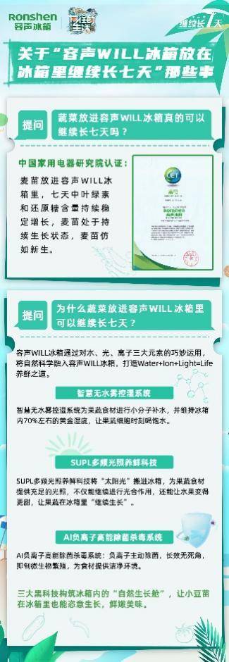 在容聲WILL559冰箱里豆子生長成豆苗,這得益于容聲一直在“養(yǎng)鮮”技術(shù)上的深耕,創(chuàng)新打造WILL養(yǎng)鮮公式,還原了豆苗的自然生長空間,將冰箱變成豆苗的“生長艙”,才實現(xiàn)了豆子放在冰箱里,生長成脆嫩鮮綠的豆苗。未來,容聲也將不斷奮進、持續(xù)創(chuàng)新,在養(yǎng)鮮的道路上越走越寬。