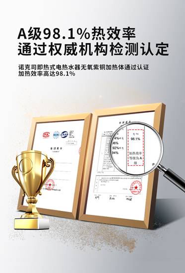 諾克司“HI-Nioheat海立特”加熱元件采用純度高達99.95%的加厚T2無氧紫銅作為發熱體核心材料,熱水器熱效率高達98.1%,大大降低了熱量損失。