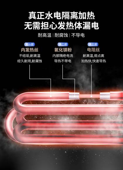 諾克司第7代“HI-Nioheat海立特”發熱系統,采用純度99.95%的T2無氧紫銅作為發熱體核心材料,穩定的理化性質,解決了電熱管在水中結垢腐蝕導致電熱絲結垢的問題。內部發熱元件和加厚無氧紫銅通過穩定導熱不導電的高純度硅鎂流體形成穩定的水電分離結構,將發熱管與水完全隔離,水路各行其道,互不干擾。