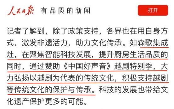創新,也正是森歌長足發展的精髓所在。無論是產品創新還是營銷模式創新,森歌始終立足消費者思維,因而所創造的“新”總能輕而易舉的走進用戶的內心。2022年10月30日,在浙江衛視播出了由森歌贊助的《中國好聲音》越劇特別季。此次森歌的贊助為文化與時代同頻共振提供新思路、新探索,不僅引起戲曲界廣泛關注,更獲人民日報、新華網等多家央級媒體紛紛點贊!