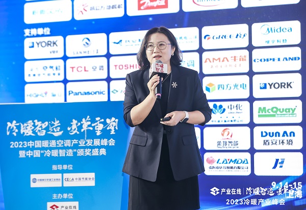壓軸主題演講是由產業在線董事長楊潔為大家帶來的“中國冷暖產業發展特征與機遇”。她概括了整個冷暖產業發展的特征,介紹了來自細分賽道的增長機會,并對產業發展形勢做出預判:整體冷暖產業將保持穩定增長,其中,家用空調面臨調整的壓力,而新能源熱管理、儲能熱管理、熱泵等新興領域將實現較高增長。