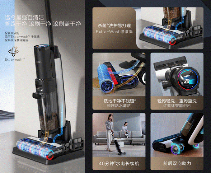 當作為洗地機時,它在芙萬3.0的超強配置之上,還搭載了全新Extra-wash凈澈洗自清潔系統,實現了“洗地頂配”。獨家的滾刷蓋升降技術可徹底解決自清潔時滾刷蓋內側清潔問題,避免用戶手動清洗的麻煩;正反轉雙向自清潔,滾刷清洗更潔凈;雙向離心風干,也大大提升了滾刷干爽度與蓬松度;結合UV除菌,既延長了滾刷的使用壽命,也保障家人健康。