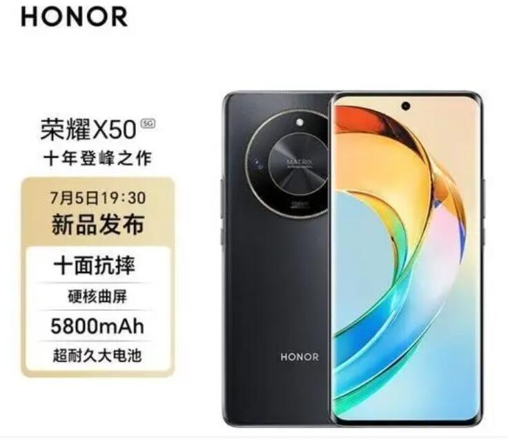 導讀: 家電消費網6月30日訊 今天,榮耀對外宣布,榮耀X50暨全場景新品發布會將于7月5日舉辦。 據了解,榮耀X50配備新一代高通驍龍6芯片,還將搭載一塊容量高達5800mAh的大電池。 榮耀X50采用了一塊全新的十