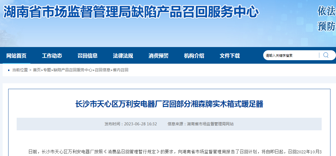 家電消費網6月30日訊 昨天,湖南長沙市萬利安電器廠向湖南省市場監督管理局報告了召回計劃,自即日起,召回2022年10月31日制造的湘森牌XS-55A-W型號實木箱式暖足器,涉及數量為30個。