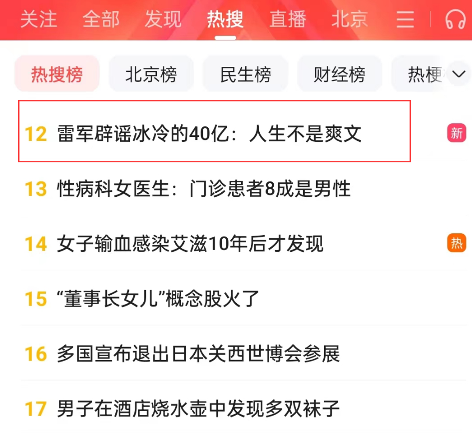 “雷軍辟謠冰冷的40億:人生不是爽文”沖上百度熱搜