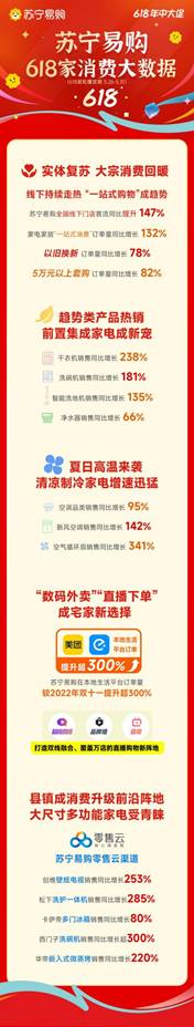 值得一提的是,今年618下沉市場成為家電消費品質化升級的前沿陣地。蘇寧易購零售云數據顯示,首輪爆發期內,大尺寸、大容量、多功能家電走俏縣鎮,創維壁紙電視銷售同比增長253%、松下洗護一體機銷售同比增長285%、卡薩帝多門冰箱銷售同比增長80%。同時,前置類、集成類等新趨勢家電在縣鄉市場呈現較高增速,西門子洗碗機銷售同比增長超300%、華帝嵌入式微蒸烤銷售同比增長220%、安吉爾的凈水品類銷售同比增長200%。