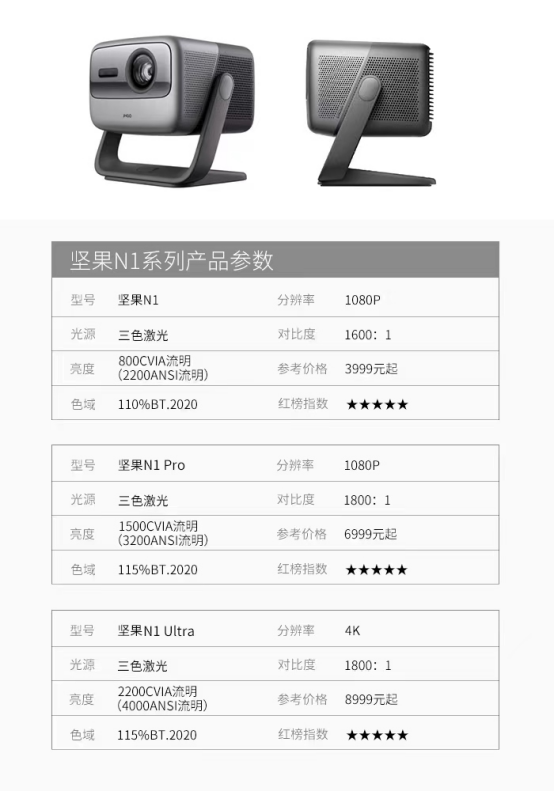 回到具體的產品來看,本次618年中大促熱賣的堅果N1系列,其核心參數在目氪TM三色激光光機的加持下,也都做到了碾壓同級別投影儀,甚至實現了躍級碾壓。