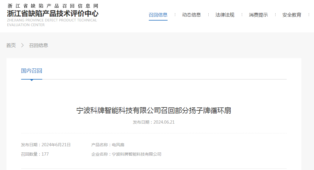 家電消費(fèi)網(wǎng)6月25日訊 昨天,寧波科牌智能科技有限公司主動(dòng)向浙江省市場(chǎng)監(jiān)督管理局和寧波市市場(chǎng)監(jiān)督管理局報(bào)告了召回計(jì)劃,自即日起,召回2023年5月26日制造的揚(yáng)子牌KYT-25 45W 220V~50Hz型號(hào)的循環(huán)扇,涉及數(shù)量為177臺(tái)。