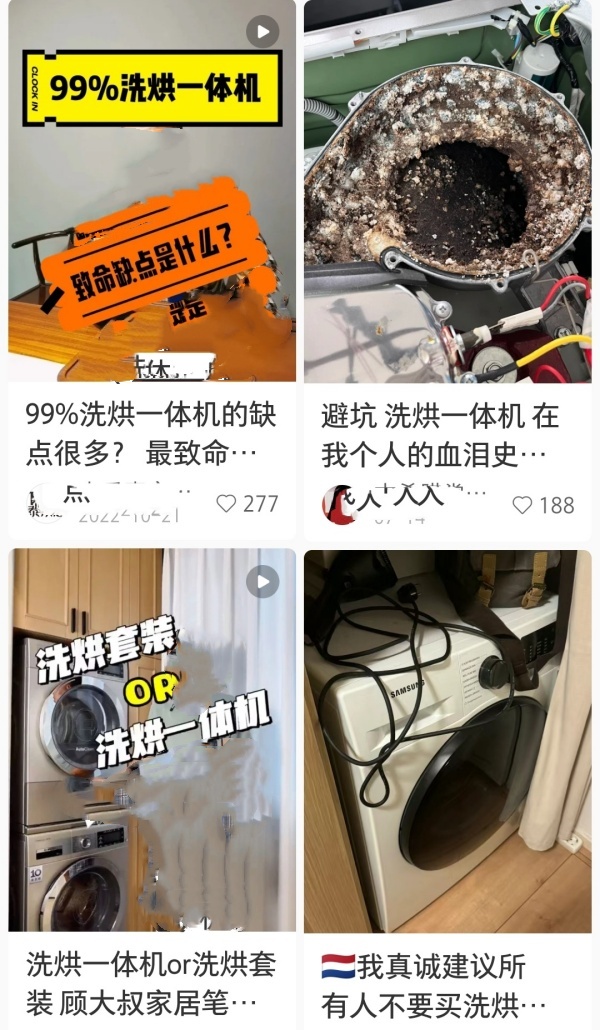 據了解,洗烘一體機在洗滌和烘干時都會產生線屑。洗滌過程中的線屑如果不做處理,有一些會附著在門封和內桶外壁上。烘干過程中的線屑如果不管,會附著在風道內部,除了長時間會堵塞風道外,還可能被加熱棒碳化,既不安全也不衛生。網上不推薦消費者購買洗烘一體機的博主多是針對這一問題。