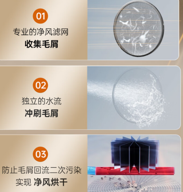 而松下洗烘一體機獨家研發的0線屑凈風系統通過多種方式配合過濾排出,讓線屑不再是問題。如將溫度傳感器外移,使得風道內部更加平滑;使用過濾網過濾風道內部的毛屑;濾網有自清潔裝置;門圈有噴淋裝置清潔,內桶也有清潔程序;特殊的清洗和排出策略避免堵塞,也避免干擾正常的洗滌和烘干。