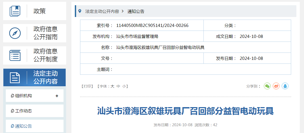 家電消費網10月10日訊 昨天,廣東汕頭市澄海區敘雄玩具廠主動向汕頭市市場監督管理局報告了召回計劃,將自即日起,召回2022年8月20日制造的益智電動玩具,型號:1009,涉及數量為144盒。