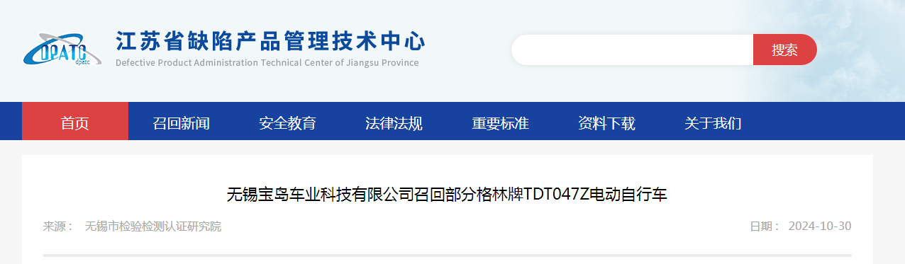 家電消費網11月2日訊 昨天,無錫寶島車業科技有限公司向無錫市市場監督管理局報告了召回計劃,自2024年10月25日起,召回2023年9月19日至2023年10月19日期間制造的格林牌TDT047Z型電動自行車,涉及數量為286輛。