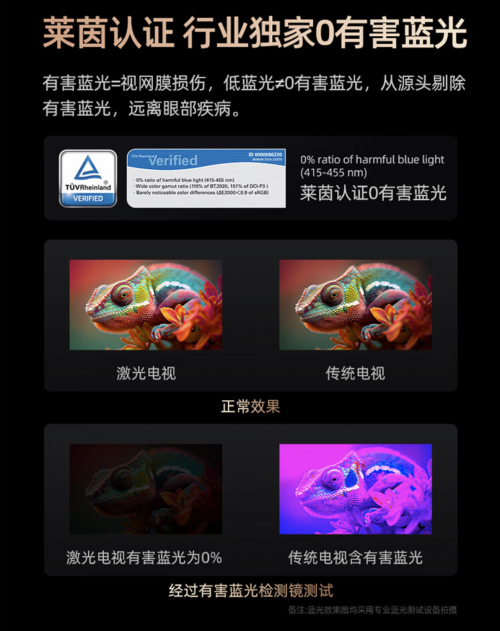 其次,激光電視的成像原理和發光特性,可以從源頭屏蔽對人眼有傷害的短波藍光波段,避免藍光傷眼的問題,更好的保護眼睛。此外它采用的反射式成像原理,光線柔和,也能有效減少長時間觀看引起的視覺疲勞。