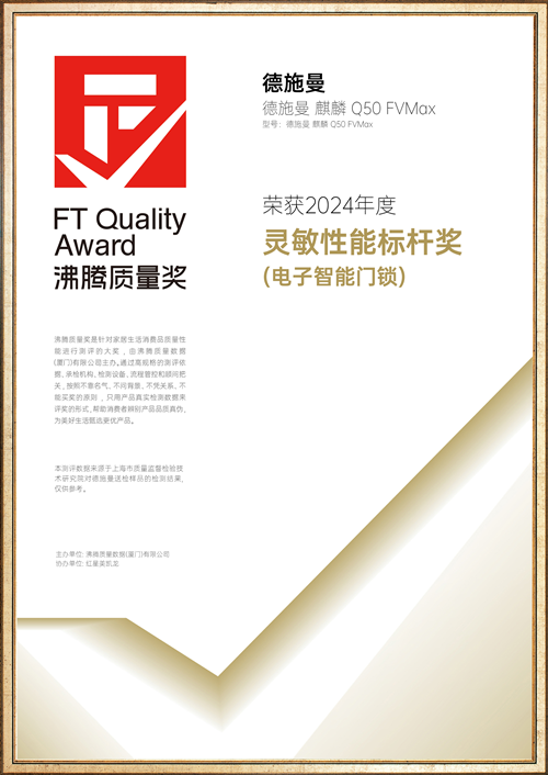 其中,德施曼高奢旗艦款玄武•紫禁城K80榮獲“沸騰質(zhì)量獎”、行業(yè)首款A(yù)I智能管家鎖麒麟R9榮獲“智能化標(biāo)桿獎”、全能旗艦款麒麟Q50FVMax榮獲“靈敏性能標(biāo)桿獎”,德施曼智能鎖再度成為行業(yè)品質(zhì)標(biāo)桿,受到行業(yè)廣泛關(guān)注。