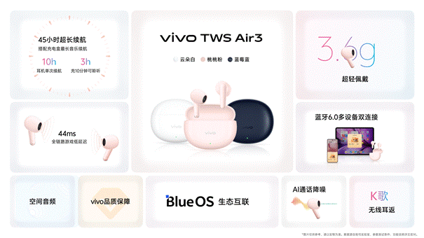 vivo TWS Air3現(xiàn)已開售,上市價格99元,單耳機僅重3.6g,支持IP54防塵抗水、至長45小時聽歌續(xù)航(配合耳機盒)、44ms全鏈路游戲低時延和藍牙6.0多設備雙連接,融入BlueOS生態(tài),是vivo生態(tài)的極佳拍檔。
