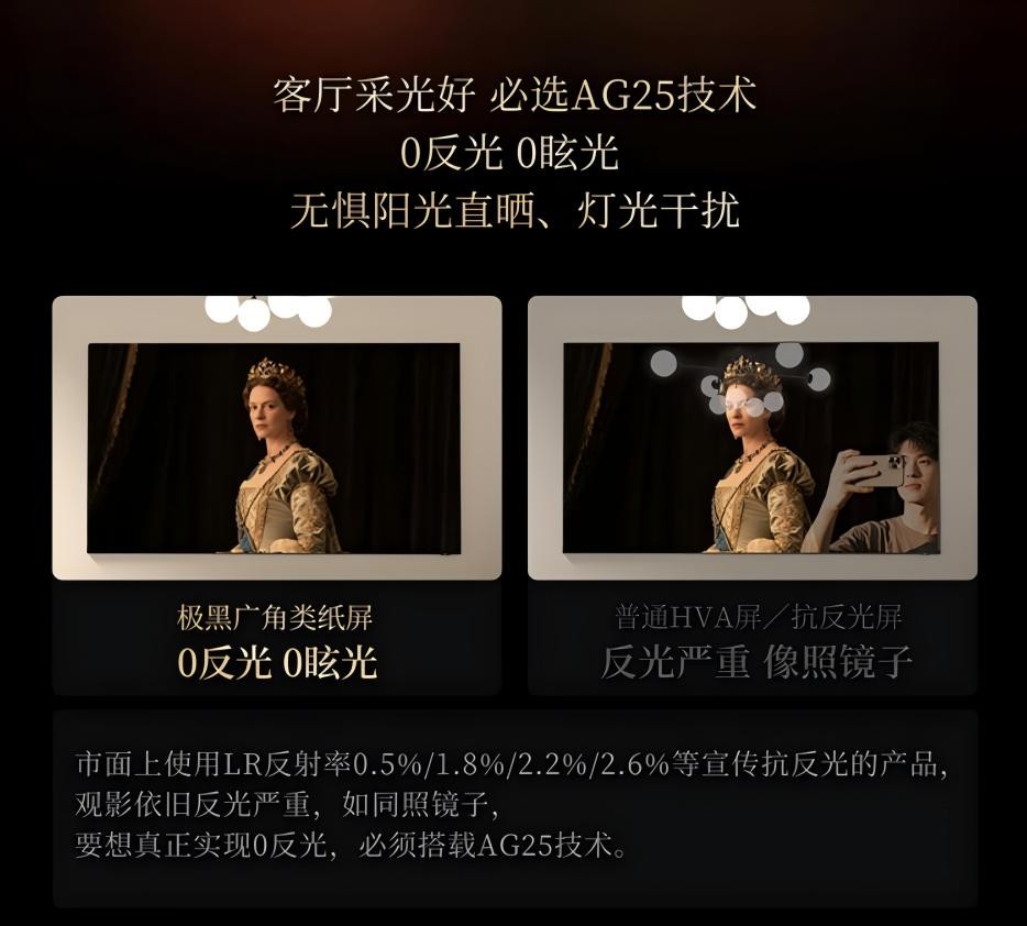 此外,A7F系列搭載的行業首發極黑廣角類紙屏,將LR低反層、STW全視角補償層和AG防眩層三者融于一屏,實現了天然黑、全角無色偏和零反光零眩光的終極體驗。特別是AG25技術,解決了市面上部分抗反光屏效果依然不佳的痛點,讓好畫質無懼光線挑戰。
