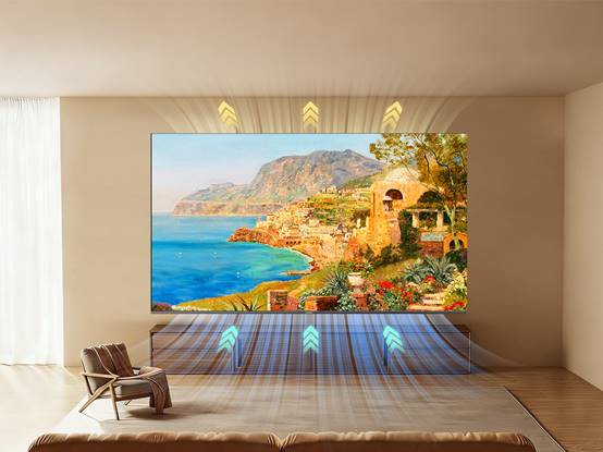 雖然“超大屏”和“0貼墻”成為了新的趨勢,但是當消費者期望它能像一幅真正的壁畫那樣完美融入家居時,傳統的結構與散熱設計已無法滿足要求。傳統結構的電視哪怕做到“貼墻”,其熱量堆積而產生的“熱島效應”會對電視和墻體造成傷害。抑或是要求電視和墻面留有足夠的散熱空間,這樣的空間限制讓“0貼墻”的視覺美學難以實現。由此,“貼墻”與“散熱” 成為了行業公認的、難以兼得的“悖論”。