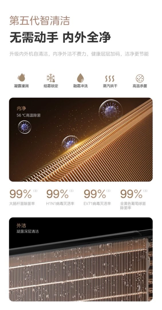 空調除菌方面,美的無風感空調·風語者F2柜掛機則通過全新升級的第五代智清潔技術,無需手動清潔,空調內機、外機都能始終保持潔凈。于內,利用56℃高溫除菌技術,可高效殺滅蒸發器上附著的灰塵、細菌、霉菌、病毒,高達99%的除菌率確保空調吹出的每一縷風都潔凈清新。于外,空調升級外機自清潔模式,外機反轉除塵的同時執行除霜動作,輕松拿捏外機上的灰塵和污垢,既保證了外機最佳的運行狀態,又解決了“外機臟了只能放任不管”的無奈,還幫用戶省去了人工干預的成本。