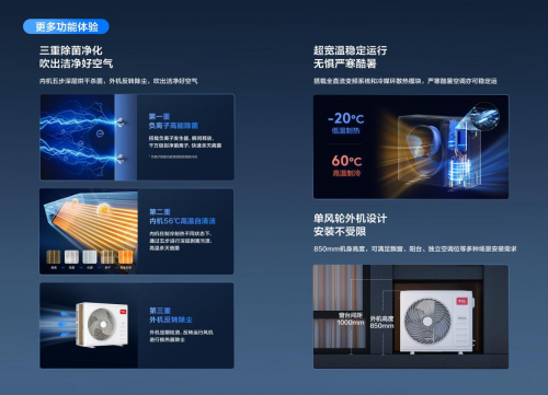 此外,TCL真省電小多聯(lián)還具備三重除菌凈化科技,包括負離子高能除菌、內(nèi)機56℃高溫自清潔、外機自動除塵三重凈化科技,從根本上保障家中空氣潔凈。其搭載全直流變頻系統(tǒng)和冷媒環(huán)散熱模塊,能實現(xiàn)超寬溫穩(wěn)定運行能實現(xiàn)60℃高溫制冷,-20℃低溫制熱,無懼嚴寒酷暑。