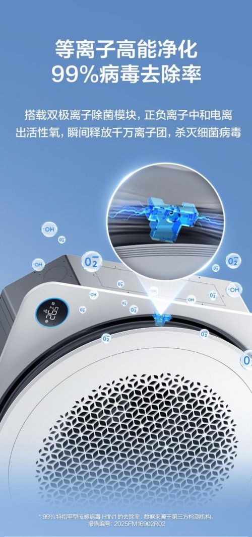 在技術層面,小藍翼天花機延續了小藍翼系列標志性的AI健康技術優勢,并實現與天花機產品特性的深度融合。該產品搭載雙極離子除菌模塊,正負離子中和電離出活性氧,瞬間釋放千萬離子團,可實現99.9%的病毒去除率,從源頭保障室內空氣健康,為用戶打造一個清新、安全的室內環境。