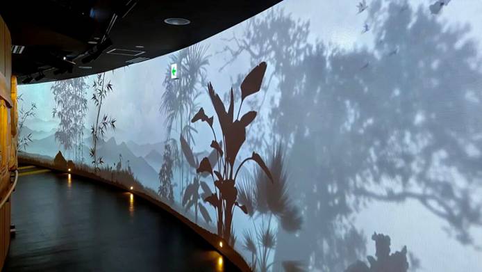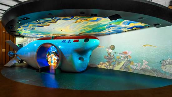 五洋遨游展項:該展項同樣采用多點位、多角度隱藏式安裝,實現“蛟龍號”裝置與弧形背景墻、地面的融合投影。觀眾可與《海錯圖》魚圖案等墻面深海元素互動,感受中國傳統海洋認知;還能操作探照燈與墻面投影互動,體驗中國深海探索成就。