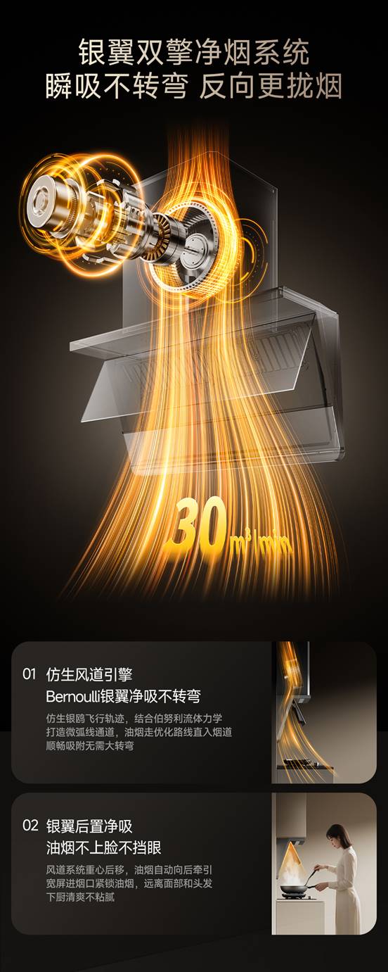 煙機(jī)可與灶具聯(lián)動(dòng),點(diǎn)火瞬間煙機(jī)自動(dòng)開啟,智能相伴,周到守候下廚時(shí)光。30m³/min澎湃風(fēng)量堪稱“吸煙速度最快的油煙機(jī)”,瞬吸油煙,雙翼攏吸鎖住熱辣鮮香,時(shí)刻維持開放式廚房的環(huán)境清新?焖傥惨槙撑,追覓凈煙機(jī)搭載1200Pa超強(qiáng)靜壓及智感巡航增壓系統(tǒng),保證持久排煙,高峰時(shí)期開火也能保障公共煙道為我所用,防止倒灌。