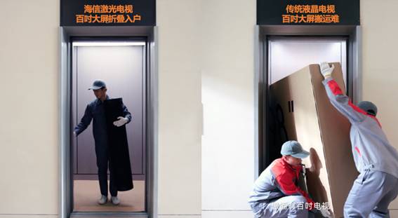 對設(shè)計師而言,除了美觀,還要充分考慮入戶安裝的便利性。海信激光電視標配可折疊屏幕,無論是100吋還是150吋,屏幕折疊后可通過電梯入戶,完美解決了百吋電視安裝還需拆窗的難題。