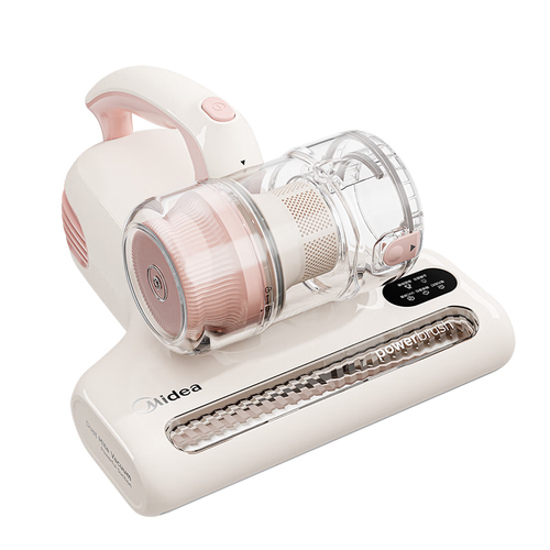 美的除螨儀采用粉白漸變配色,機身線條圓潤精致,體積小巧(約 32cm 長),可輕松伸入床底、沙發縫隙等狹窄區域。手柄處配備智能屏顯,實時顯示工作模式(強力 / 輕柔)、剩余電量,避免清潔中途斷電,尤其適合記性較差的用戶。