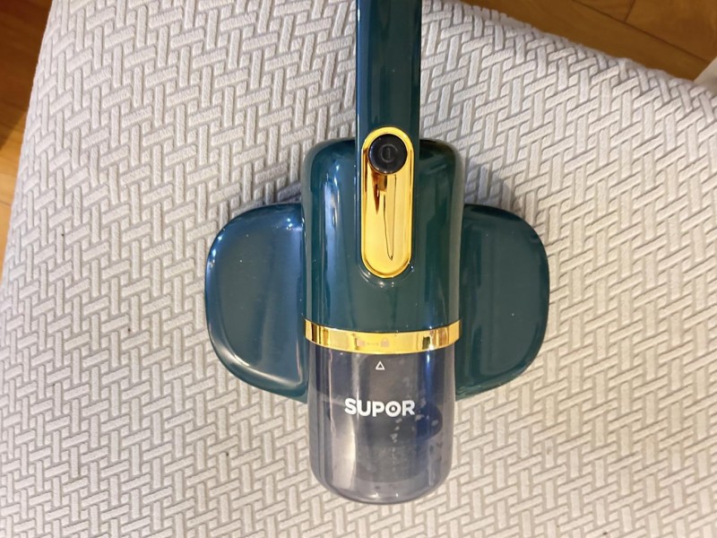 蘇泊爾除螨儀以 “復古綠” 為主色調,搭配流暢圓潤的機身線條,無尖銳棱角設計,既美觀又能避免清潔時刮擦家具、皮膚。人體工學手柄握持感舒適,黑色電源按鈕位于手柄前端,指尖輕按即可開關機,老人、寶媽也能輕松上手。