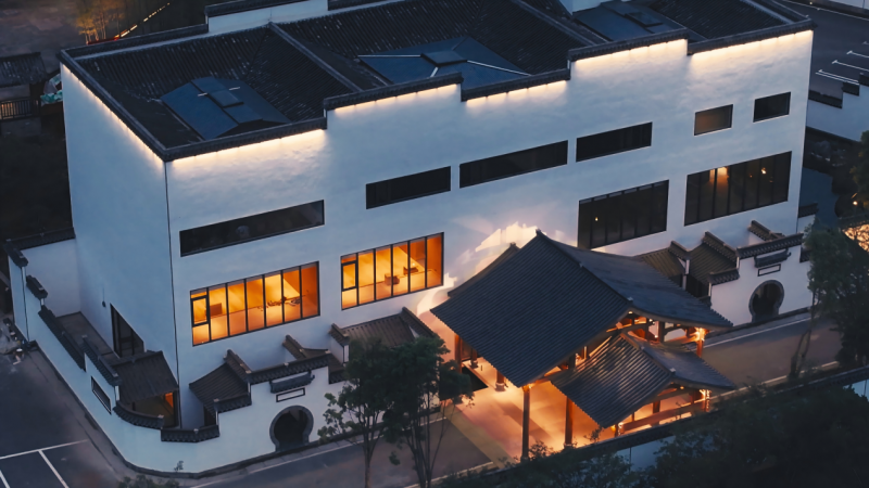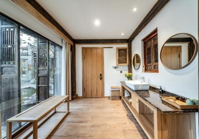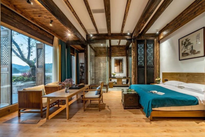 厚塘莊園整體空間設計,運用干凈的線條、中性色調和開放式空間,營造寧靜氛圍。古徽派建筑與新中式設計客房相結合,白墻青瓦,古色古香。