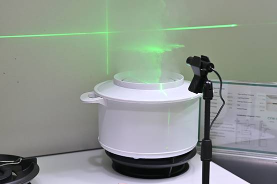 而想要油煙不“漏網(wǎng)”,光靠高風(fēng)速還不行,需要對(duì)轉(zhuǎn)氣旋打輔助。對(duì)轉(zhuǎn)氣旋能在鍋的表面剛產(chǎn)生細(xì)微顆粒物和氣味分子時(shí)就把它控制住,即便是濃度最高時(shí)也不容易逸散,都會(huì)被13~15m/s、堪比7級(jí)大風(fēng)的高風(fēng)速帶走,所以炒菜都不會(huì)聞到辣椒味。