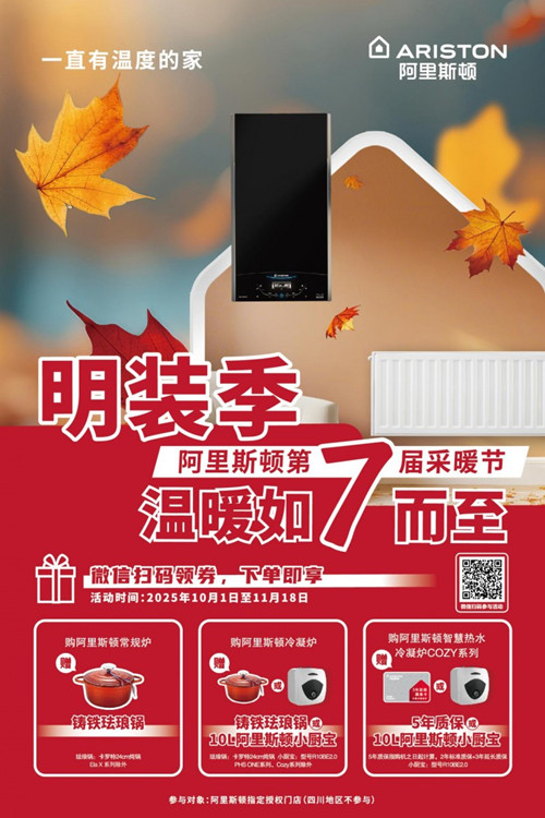 當秋風漸起、寒意初臨,阿里斯頓旗下全系列壁掛爐產品以懂生活的貼心設計與創新科技,為家庭筑起溫暖屏障,以全程貼心的一站式服務,化解從安裝到使用的所有顧慮。阿里斯頓用科技回應生活所需,用服務承載安心承諾,讓每一個家庭在秋冬無懼寒涼,在四季中擁抱舒適,讓一直有溫度的家融入日常生活的每一刻。2025年10月1日起至2025年11月18日,微信注冊阿里斯頓會員并下單購買阿里斯頓壁掛爐參與阿里斯頓第7屆采暖節,即享多重家居好禮,下單即送,助您溫暖過冬!阿里斯頓以科技與服務并重,讓溫暖如期而至,用安心守護家的每一刻舒適。