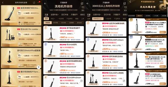 其中,追覓T60 Ultra洗地機登陸京東家用洗地機金榜Top 20、抖音商城洗地機爆款榜Top 5,成為該榜單唯一一個高端旗艦級產品,成為高端洗地機品類中備受用戶信賴的代表作。追覓T50 Ultra則雙雙獲得天貓洗地機熱賣榜及3000元以上洗地機熱銷榜Top 1。
