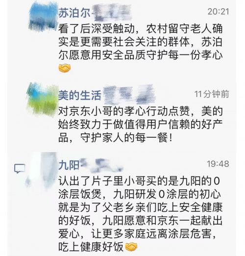 截圖顯示,美的相關負責人在回應中為“京東小哥”的孝心點贊,并表示“美的始終致力于做值得用戶信賴的好產品,守護家人的每一餐”;九陽相關負責人表示,九陽愿意和京東一起獻出愛心,讓更多家庭遠離涂層危害,“九陽研發0涂層的初心就是為了父老鄉親們吃上安全健康的好飯”;蘇泊爾相關負責人回應稱,“農村留守老人確實是亟需社會關注的群體,我們愿意用安全品質守護每一份孝心。”