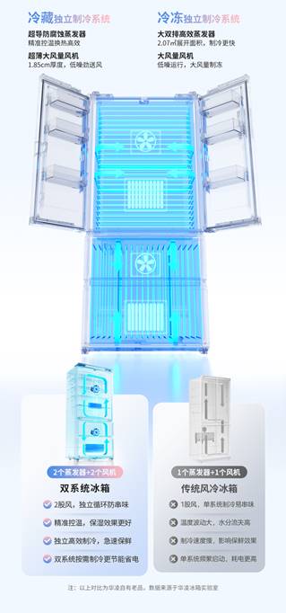 而華凌神機518新品搭載2個蒸發器+2個風機,冷藏冷凍雙系統雙循環防串味,上存榴蓮,下放冰淇淋,互不打擾;雙系統獨立制冷,急速保鮮,肉類營養口感不流失;搭配高保濕空間,讓綠葉菜持久水靈。