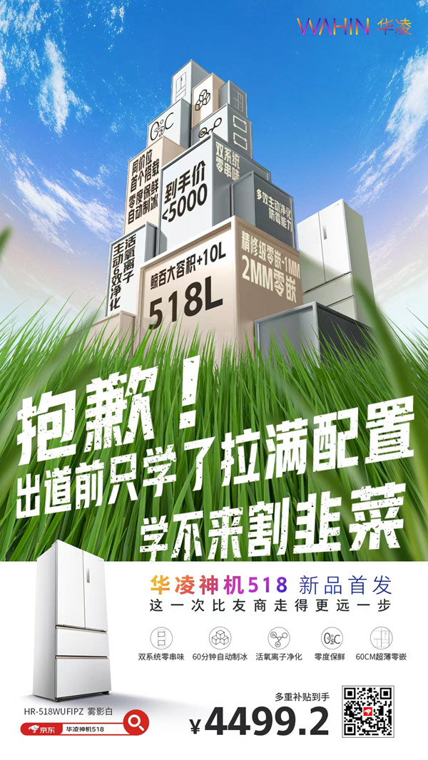 雙系統不串味、零嵌入更美觀、一鍵制冰暢享清涼、「活氧」零度保鮮守護健康——華凌神機518新品的每一項功能,都是對品質生活的精準回應。而四千出頭的預算、萬元級配置,打破了價格與體驗的邊界,成為年輕人追求新鮮、自由與質感生活的全新起點。
