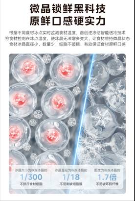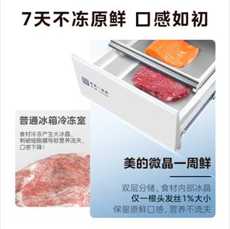 技術的人性化升級更顯巧思:“微晶一周鮮”專屬抽屜采用“上魚下肉”的上下分儲設計,,針對海鮮、魚類食材優化溫度參數,下層則為牛羊肉等肉類定制保鮮環境。實測數據顯示,新鮮牛肉存入下層抽屜7天后取出,表面干爽無血水滲出,達到國際領先水平的1級口感保鮮標準。