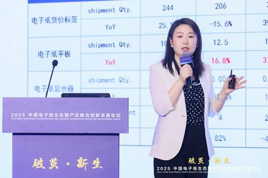 洛圖科技COO王育紅女士帶來了題為《電子紙顯示技術主要應用終端發展趨勢報告》的市場解讀。其中,不少細分市場的數據在報告中首次公開。2024年,電子紙技術顯示產值規模超142億美金,躋身全球各新型顯示技術的前列,同比2023年的增幅為29%。預測2025年全球電子紙智慧零售端價簽出貨量將達3.6億片,電子紙平板出貨量近1900萬臺。以電子紙價簽,電子紙閱讀器,電子紙辦公本為代表的品類脫穎而出,形成“2+1+N”的應用終端場景化生態布局。在中國市場,預計2025年中國電子紙平板市場的出貨量為310萬臺,增速超過30%,遠高于全球9.3%的水平。她總結到,電子紙顯示是具有時代使命感的創新顯示技術,未來會在更多元的場景下展現創新的應用。