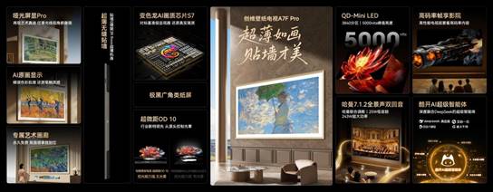 其中,A7F Pro系列擁有2304~5184分區控光,能夠精準調節明暗細節,實現像素級精準控光,黑場純粹,亮部有層次。其QD-Mini LED全鏈路AI控光系統,融合五大核心技術,包括雙芯16晶芯片、光學超微透鏡、超微OD、瞬時光色同控和雙路24bit混合調光,確保每一個Mini LED燈珠控制精準,帶來“高亮無光暈、極黑高對比、細節超清晰、色彩更真實”的卓越視覺體驗,全面超越普通藝術電視。