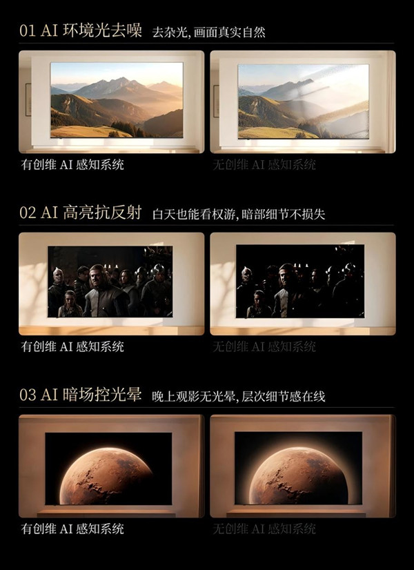環(huán)境光同樣對畫面最終呈現(xiàn)的效果有巨大的影響。創(chuàng)維首創(chuàng)AI環(huán)境感知系統(tǒng),構(gòu)成了實(shí)現(xiàn)真實(shí)畫質(zhì)的必要前提。作為一套復(fù)雜精密的AI系統(tǒng),它能夠?qū)崿F(xiàn)AI環(huán)境光去噪、AI高亮抗反射、AI暗場控光暈等精細(xì)化操作。其能識(shí)別從0到100000lux的超廣環(huán)境光照范圍,真正實(shí)現(xiàn)24小時(shí)全天候光感,感知精準(zhǔn)度較普通光感提升36%。這意味著無論是在陽光明媚的午后,還是在燈光昏暗的深夜,電視都能主動(dòng)適應(yīng)環(huán)境,實(shí)現(xiàn)強(qiáng)光下觀影高亮不過曝、暗場景觀影真實(shí)無光暈,為用戶帶來真實(shí)好畫質(zhì)的同時(shí)讓觀感穩(wěn)定且舒適,這對需要應(yīng)對家庭多場景的Mini LED電視尤為關(guān)鍵。