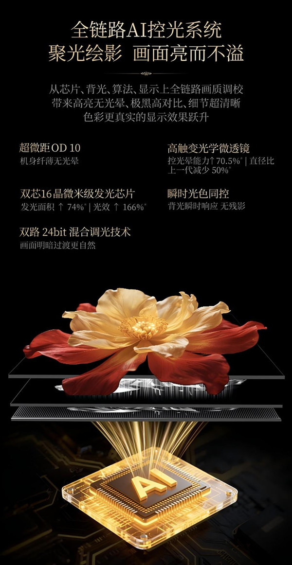 變色龍顯示技術(shù)平臺(tái)之所以能實(shí)現(xiàn)對真實(shí)的精準(zhǔn)還原,關(guān)鍵在于其擁有三大行業(yè)首創(chuàng)的領(lǐng)先技術(shù):超微距OD10、變色龍AI畫質(zhì)芯片S7,以及AI環(huán)境感知系統(tǒng)。