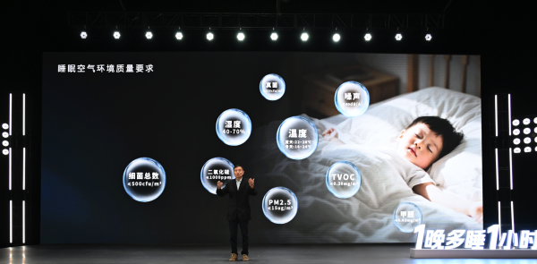 吳教授進一步闡述了環境優化的兩個關鍵方面:首先,適宜的溫濕度控制對睡眠和健康至關重要。海信新風空調通過溫濕度精準控制、柔風防直吹以及16分貝呼吸般靜音等創新技術,為用戶營造出更舒適的睡眠環境;其次,控制室內污染物也是改善睡眠的關鍵。二氧化碳濃度是室內空氣質量的最重要指標,其升高往往伴隨顆粒物、細菌、裝修污染物及異味等有害物質的增加,海信新風空調可以有效降低二氧化碳濃度,提供增氧好空氣,從而改善睡眠環境,起到顯著的助眠效果。