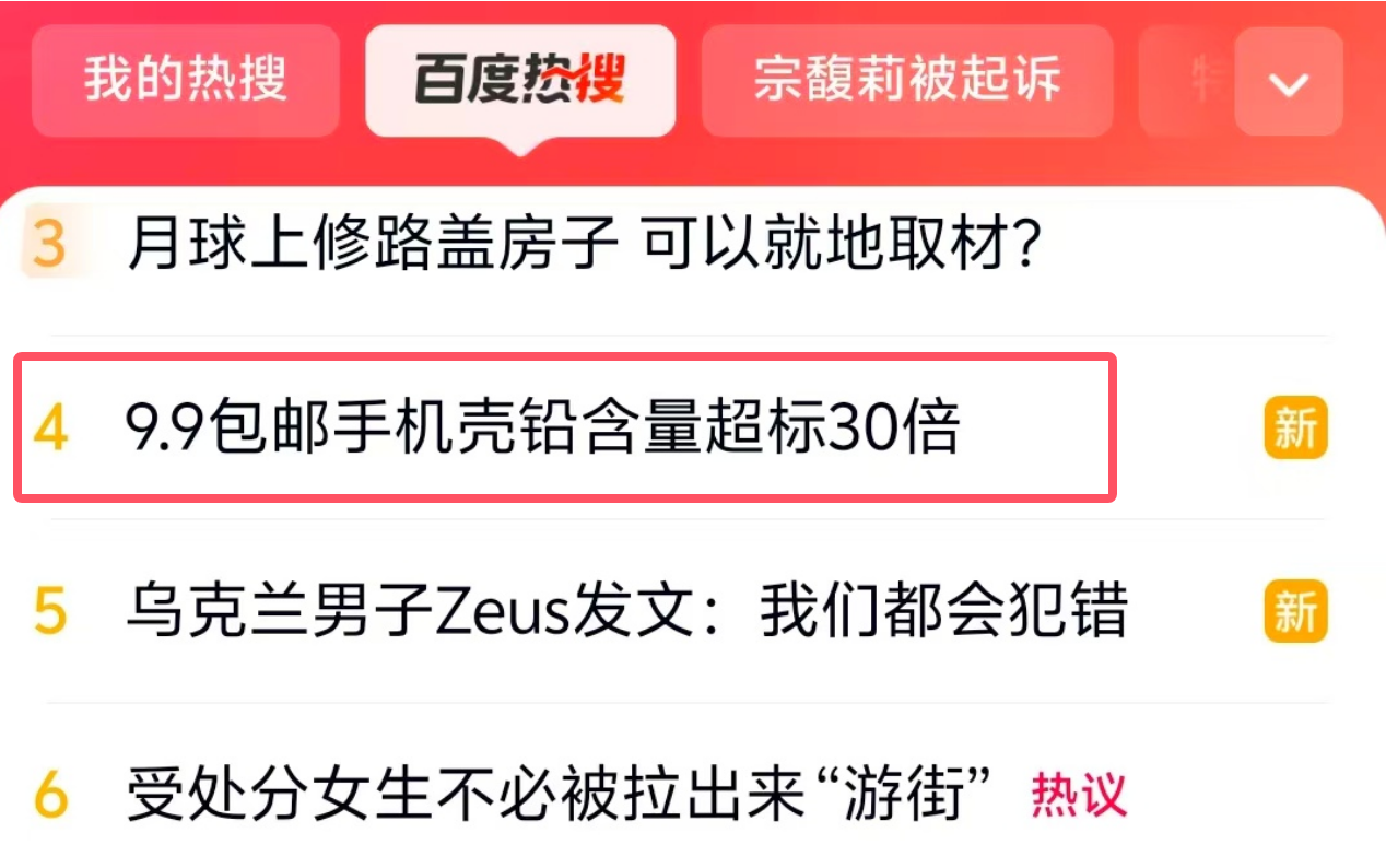 “9.9包郵手機殼鉛含量超標30倍”沖上百度熱搜 網友:商家不應該賣