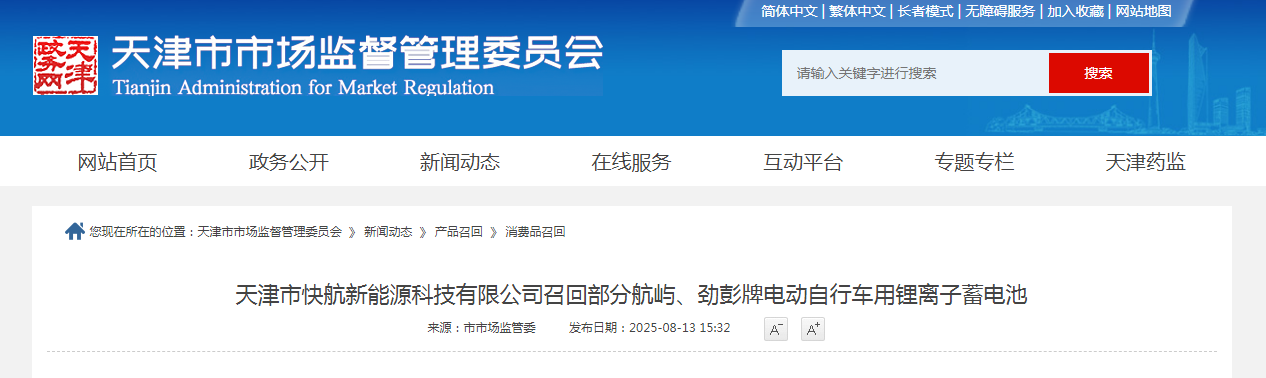 據了解,本次召回范圍內的電動自行車用鋰離子蓄電池,由于短路保護功能失效,可能導致電池起火,存安全隱患。