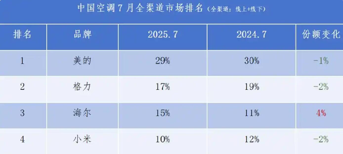 家電消費網8月18日訊 昨天,“小米7月空調線上銷量超格力”沖上百度熱搜,來自大數據公司奧維云網的數據顯示,線上銷量前三名分別是美的、小米、格力。同時,來自大數據公司奧維云網的數據顯示,今年7月全渠道空調銷售,前三名分別是美的、格力、海爾。也就是說,無論全渠道銷售還是線上銷售,第一都是美的空調,而不是格力了。