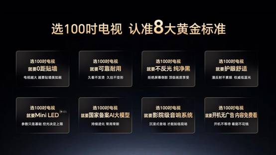 隨著大宅寬廳成為新趨勢(shì),電視消費(fèi)加速“超大屏化”,但尺寸的增長(zhǎng)并未帶來體驗(yàn)的同步升級(jí)。此次由中國(guó)電子商會(huì)與中國(guó)電子技術(shù)標(biāo)準(zhǔn)化研究院權(quán)威發(fā)布的《百吋電視選購(gòu)白皮書》,直面用戶痛點(diǎn),提出了新一代百吋電視的八大黃金標(biāo)準(zhǔn)。包括0距離貼墻、搭載黑晶廣角無影屏,及可靠耐用、護(hù)眼舒適、MiniLED、AI大模型、影院級(jí)音響系統(tǒng)以及開機(jī)無廣告內(nèi)容免費(fèi)看。
