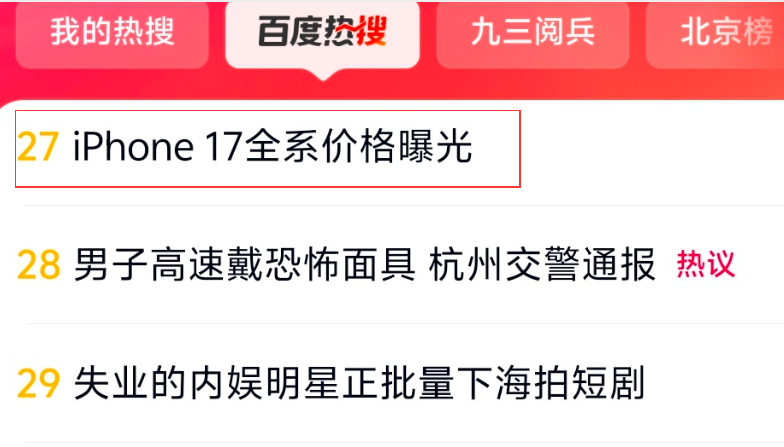 “iPhone17全系價格曝光”沖上百度熱搜:比16系漲500元