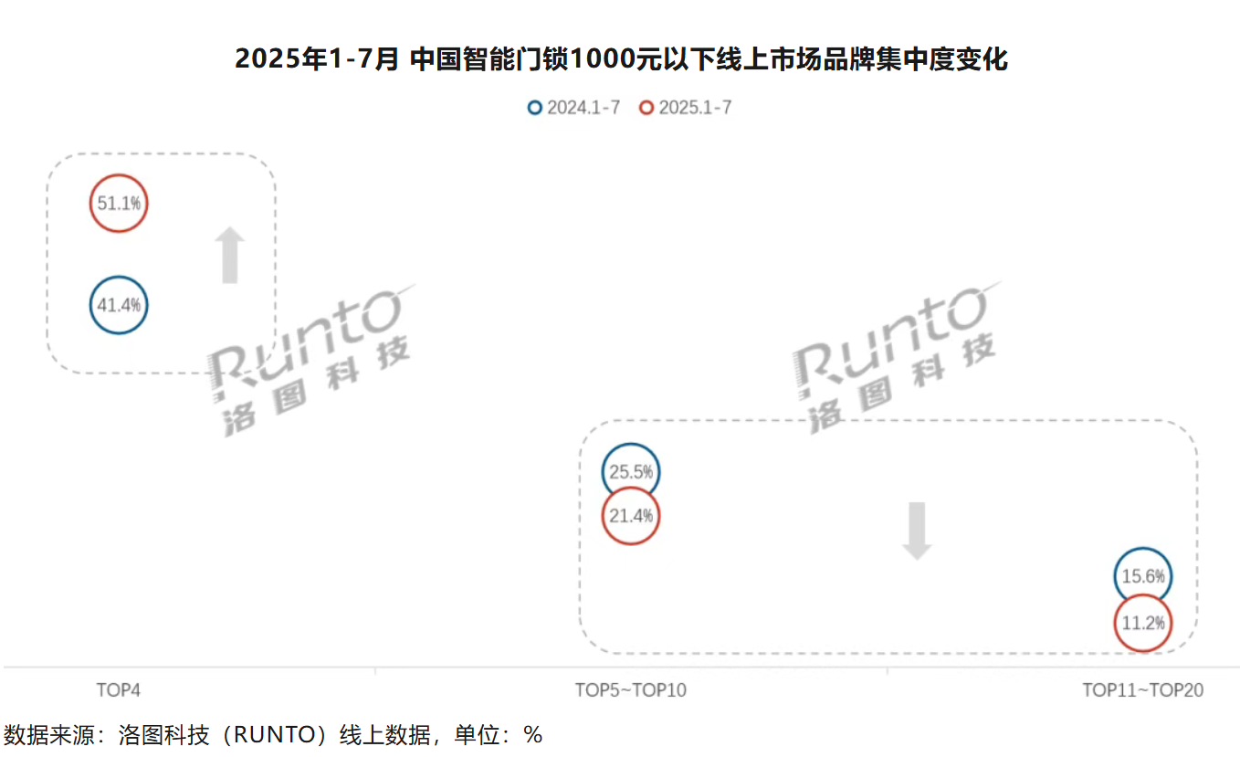 家電消費網9月1日訊 昨天,大數據公司洛圖科技(RUNTO)發布的線上全渠道數據顯示,2025年1-7月,在主流電商平臺上的千元以下市場中,在售品牌數為313家,其中新進入的品牌數占比竟高達21.4%。然而,在千元以下的智能門鎖市場,由于頭部品牌對其的重視以及自身的資源優勢,市場集中度反而呈現了上升趨勢。今年前7個月,在細分市場的TOP4品牌銷量份額(CR4)增長至51.1%,同比增長了9.7個百分點。