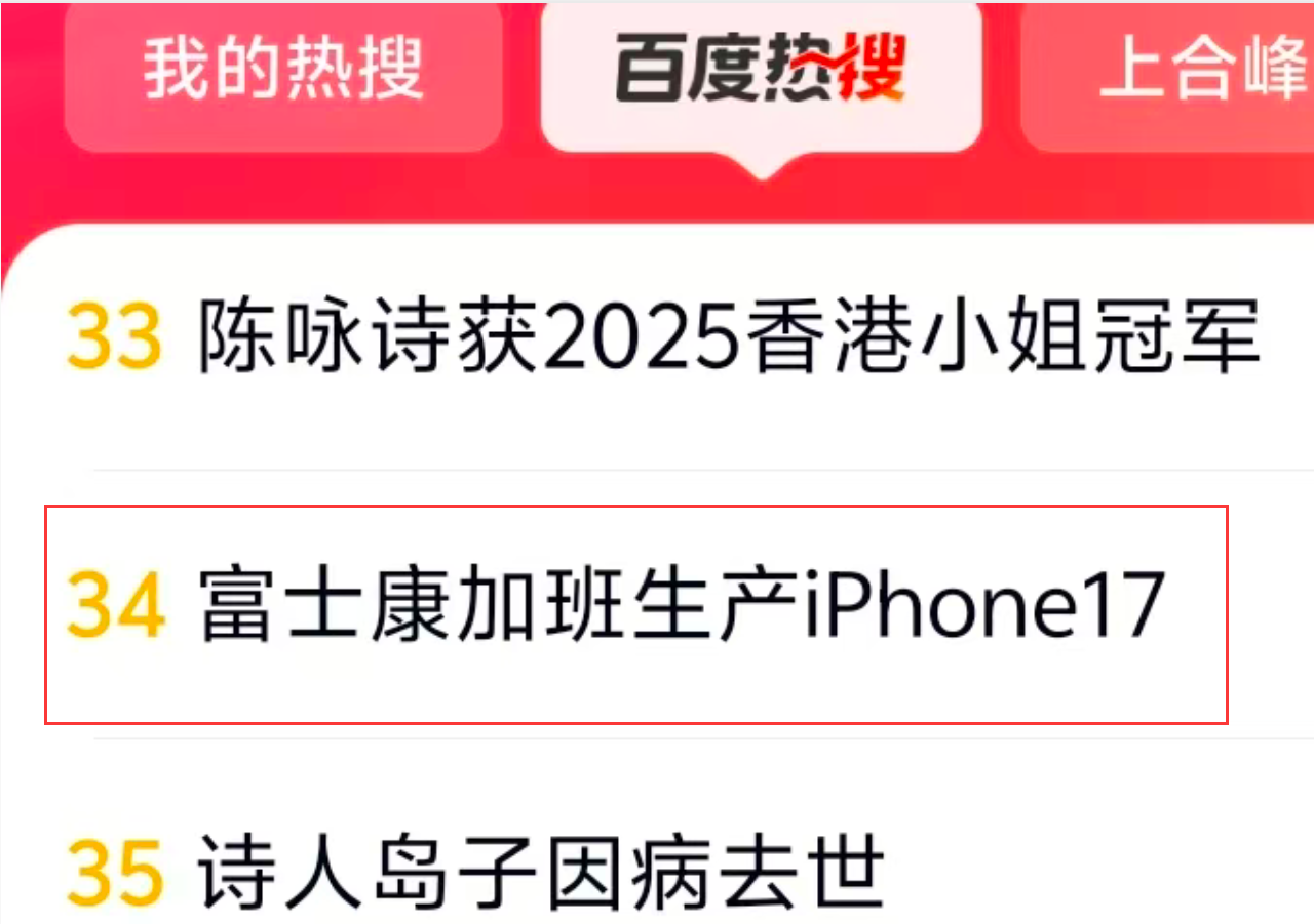 家電消費網9月1日訊 今天,“富士康加班生產iPhone17”沖上百度熱搜。