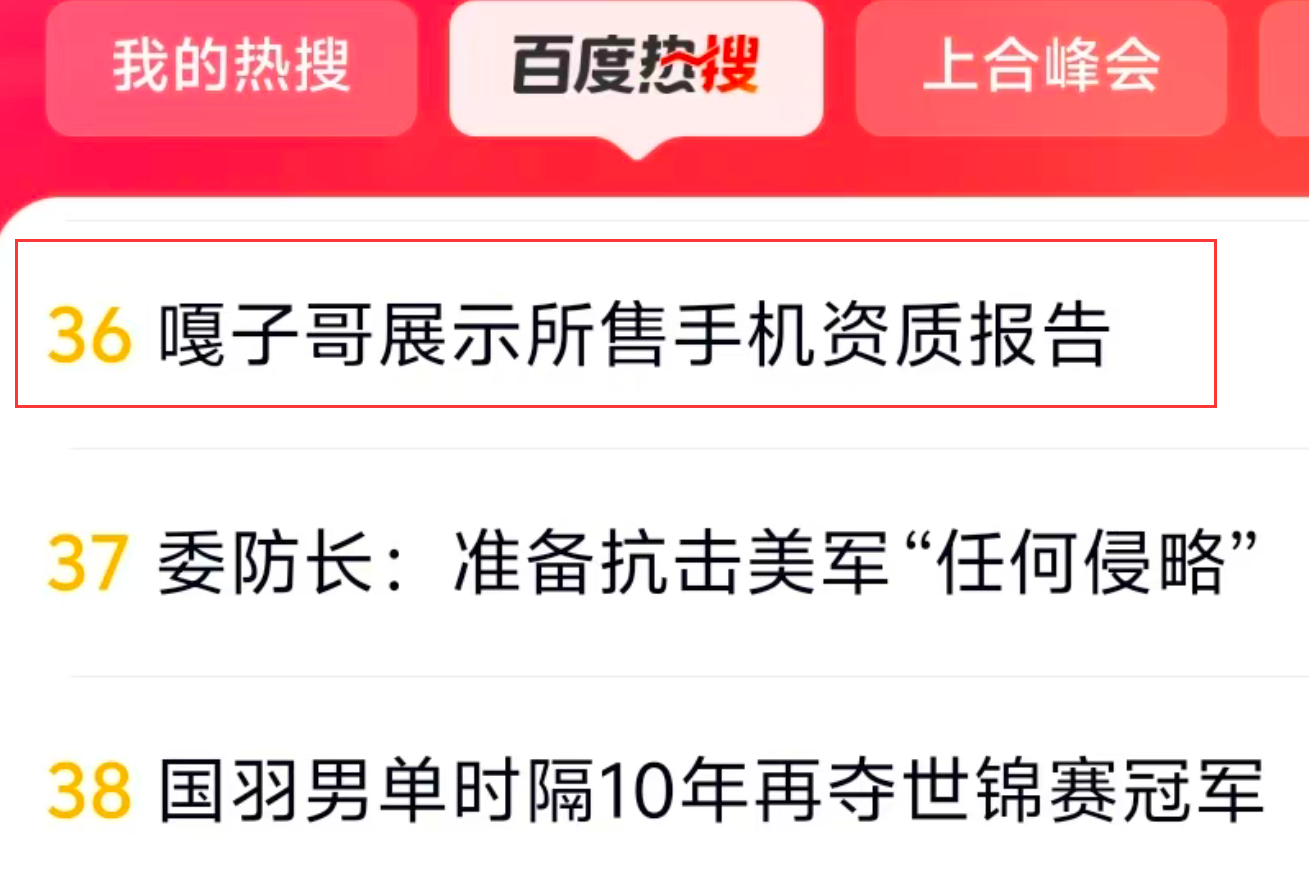 - “嘎子哥展示所售手機(jī)資質(zhì)報(bào)告”沖上百度熱搜